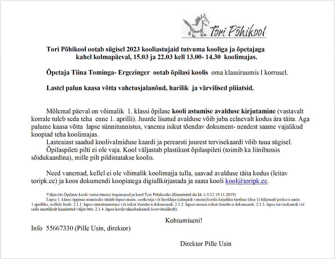 Ootame sügisel 2023 kooliastujaid Tori koolis 15.03 ja 22.03.2023