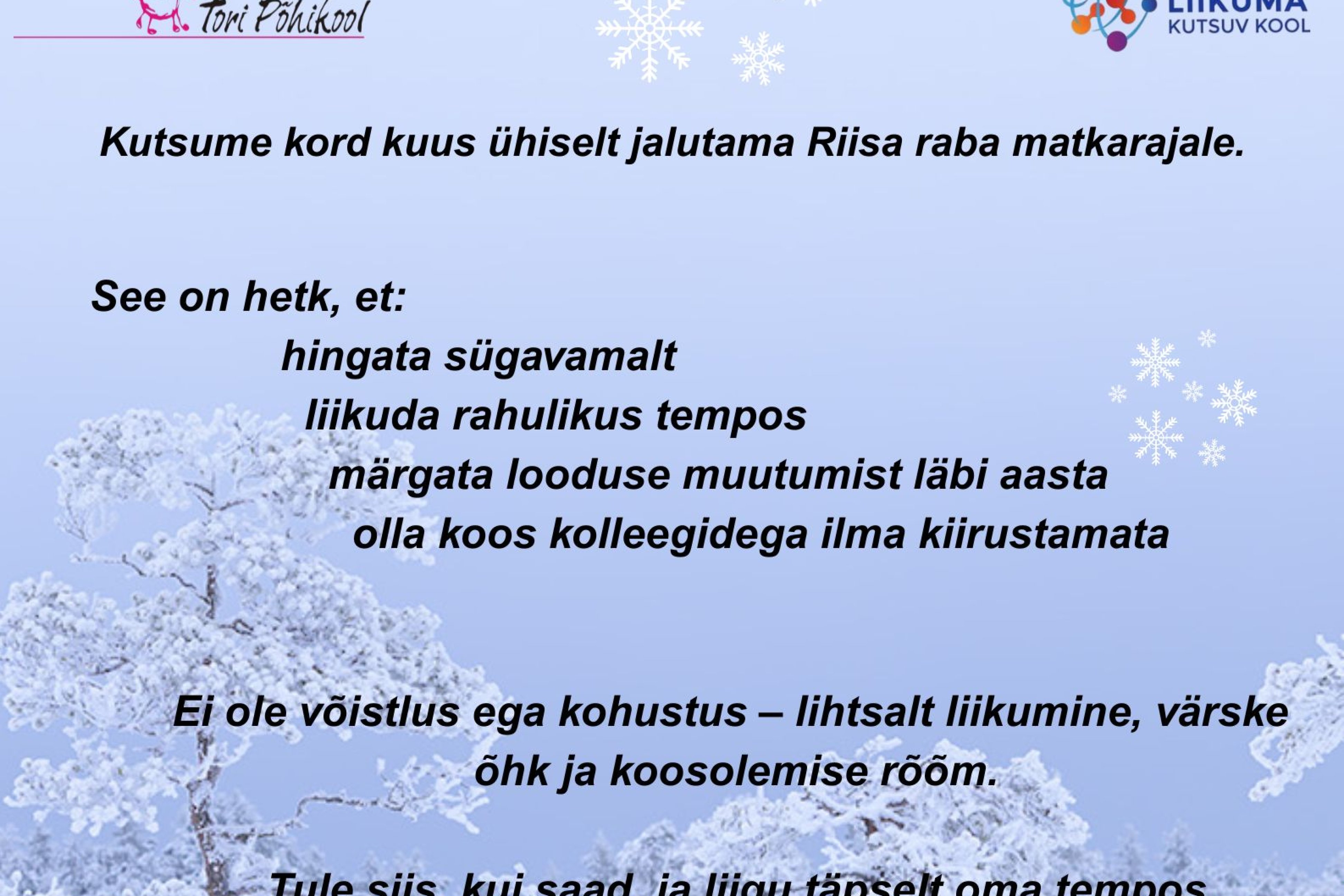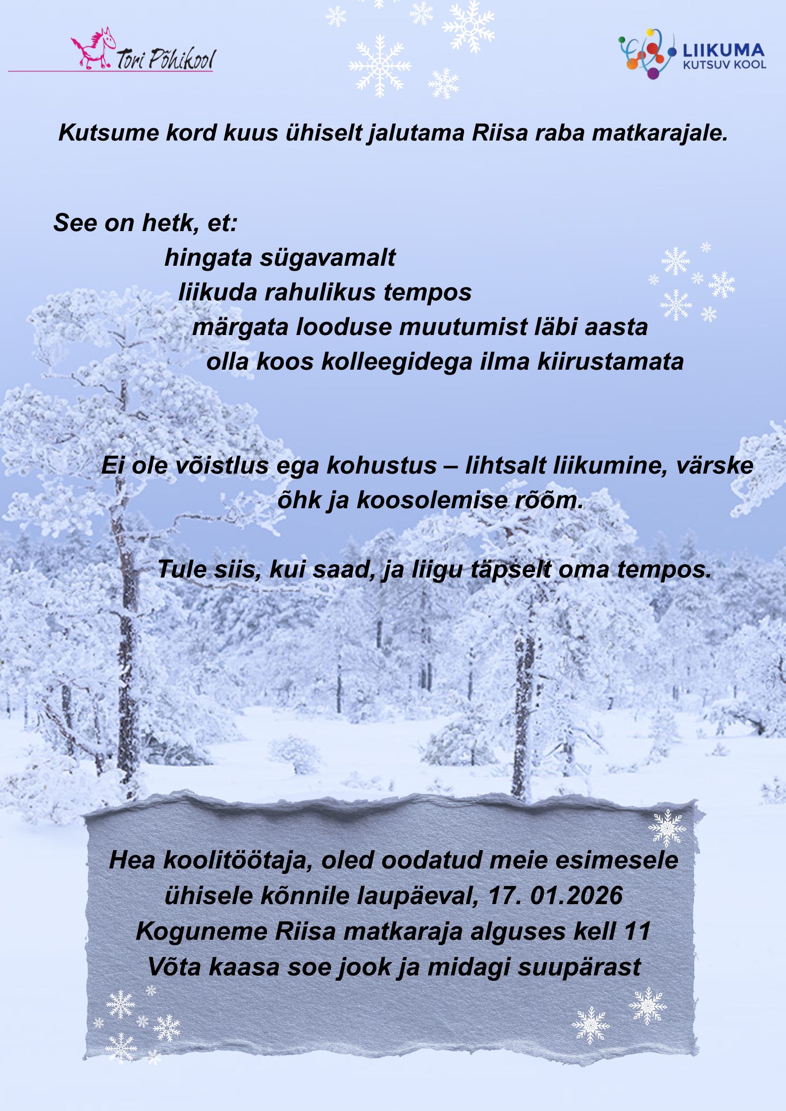 Esimene ühiskõnd tõnisepäeval, 17.01.2026, algusega 11.00 Riisa matkarajal.