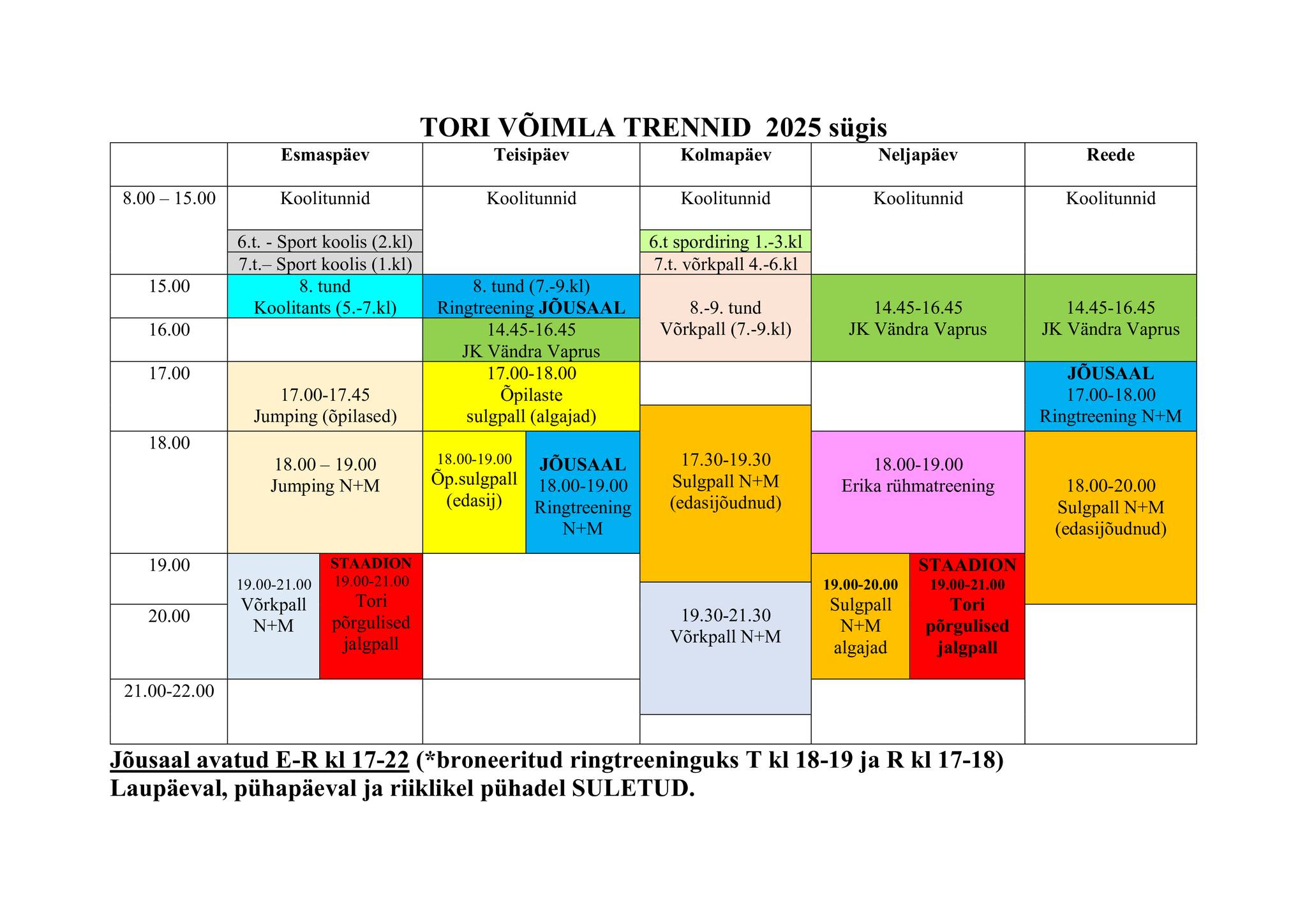 Tori trennide ja jõusaali ajad alates 2025 sügis.link opens on new page